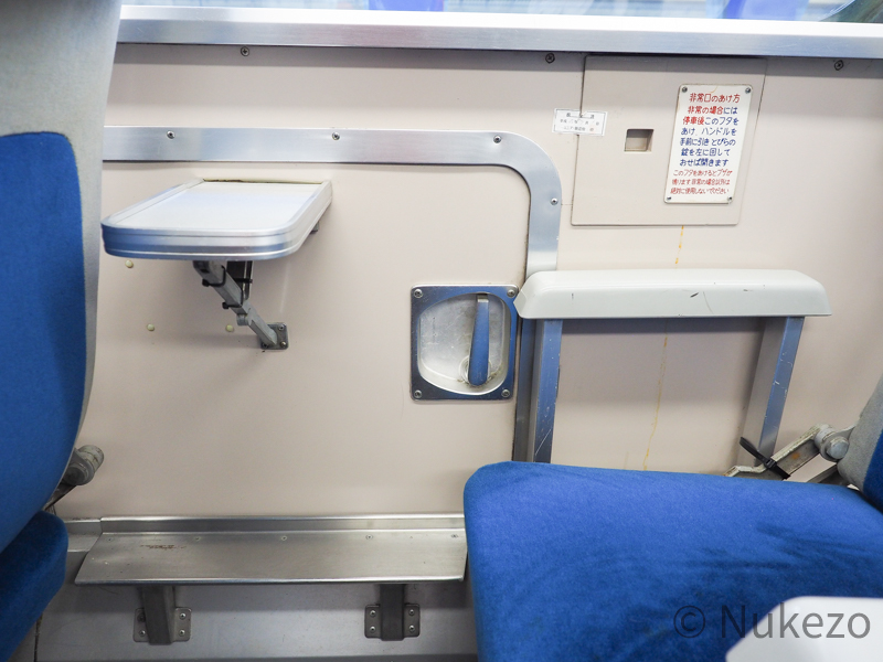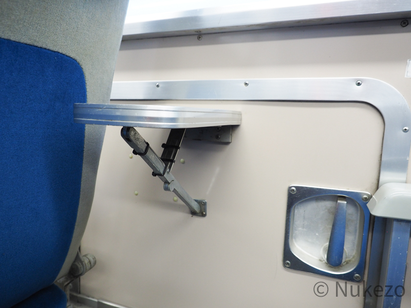 窓側の小テーブルは基本的に固定式ですが、非常口部分のテーブル折りたたみ式となっています。