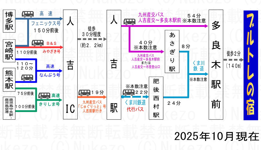 ・2024年2月現在、JR肥薩線・くま川鉄道は豪雨災害により一部不通。従って、現在は博多・宮崎・熊本・鹿児島など九州の各都市から、高速バスと路線バスの乗り継ぎで向かうのが現実的な「ブルートレインたらぎ」へのアクセス手段となる。