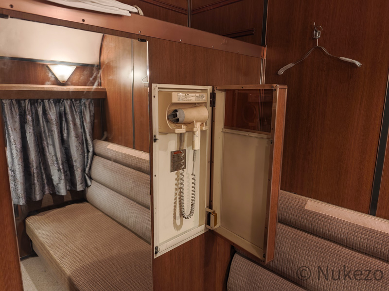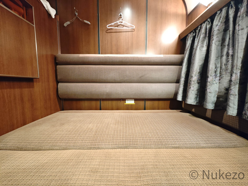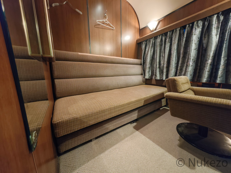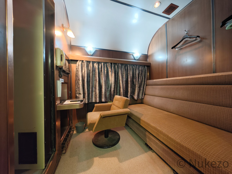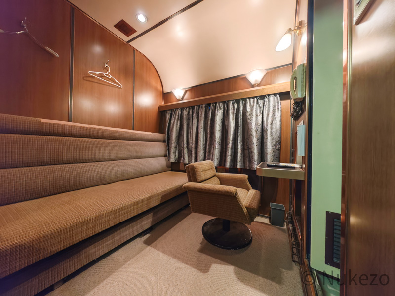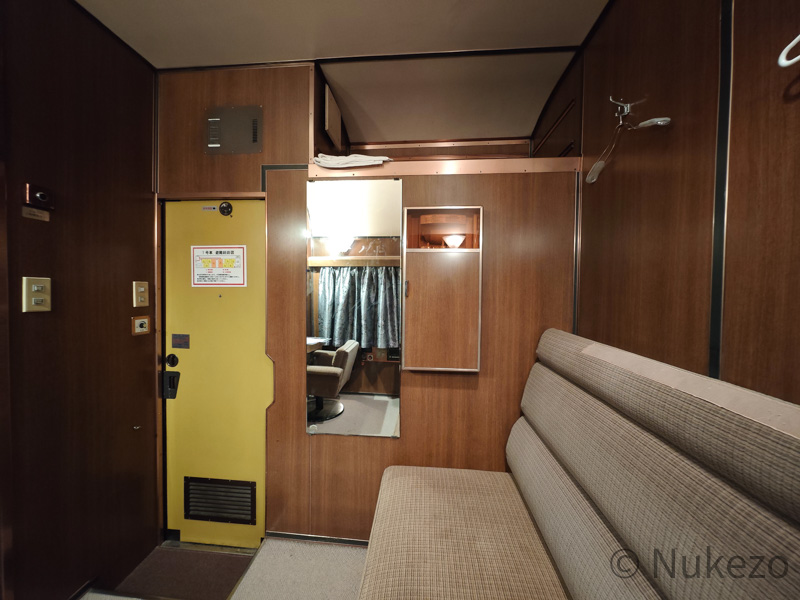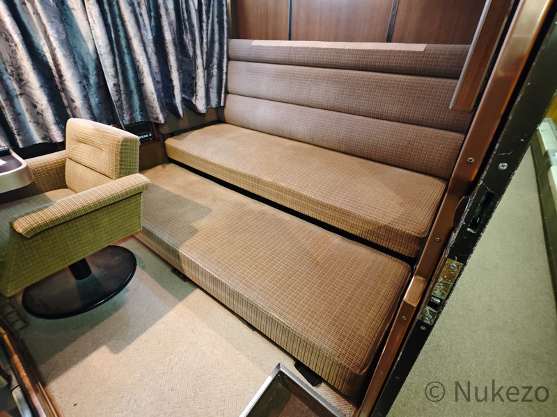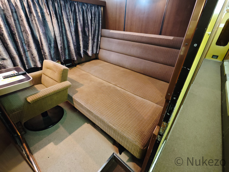 1号車の11号室・12号室が「ロイヤル」となっており、写真は11号室で撮影しています。シートカバーやリネン類こそ撤去されていますが、往時の雰囲気がよく残っていました。