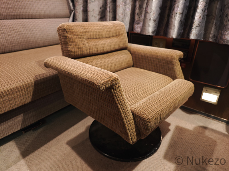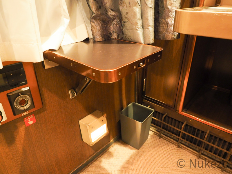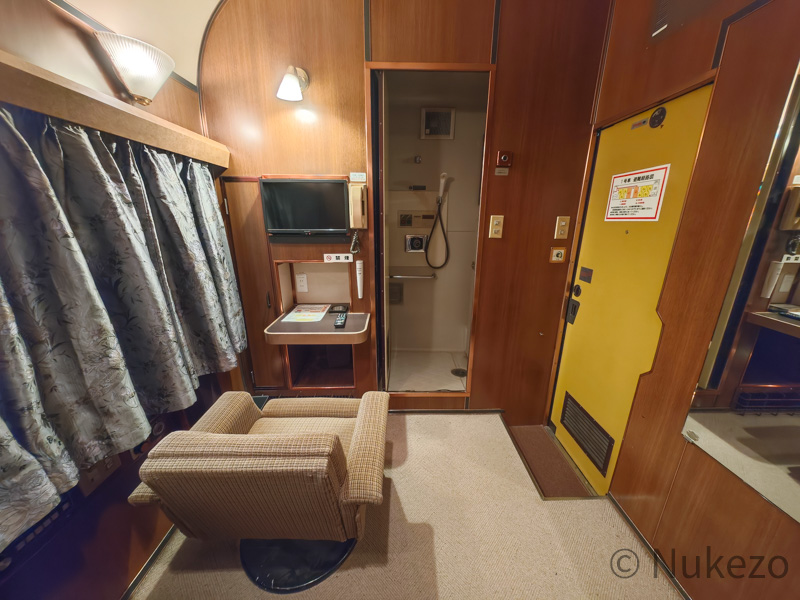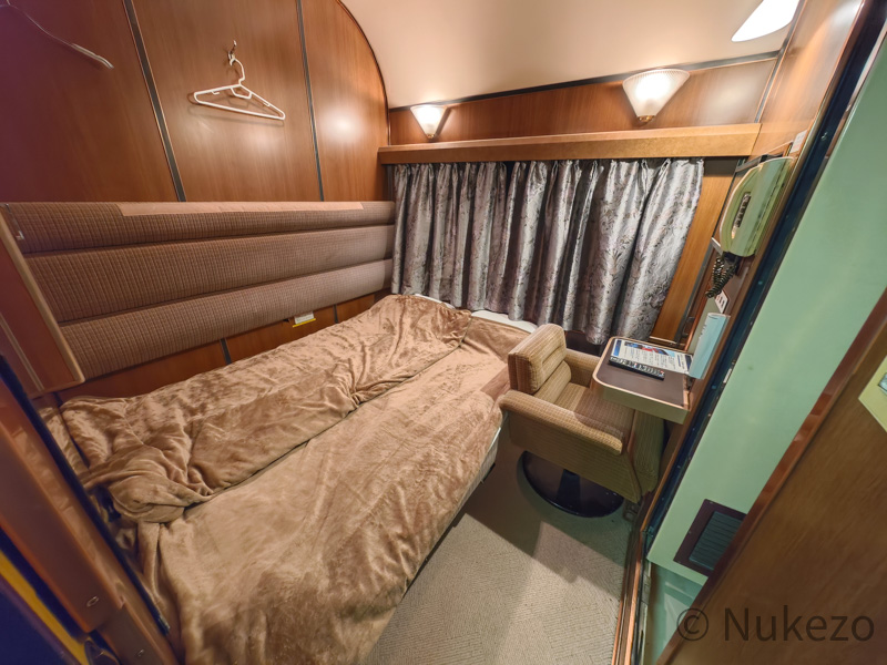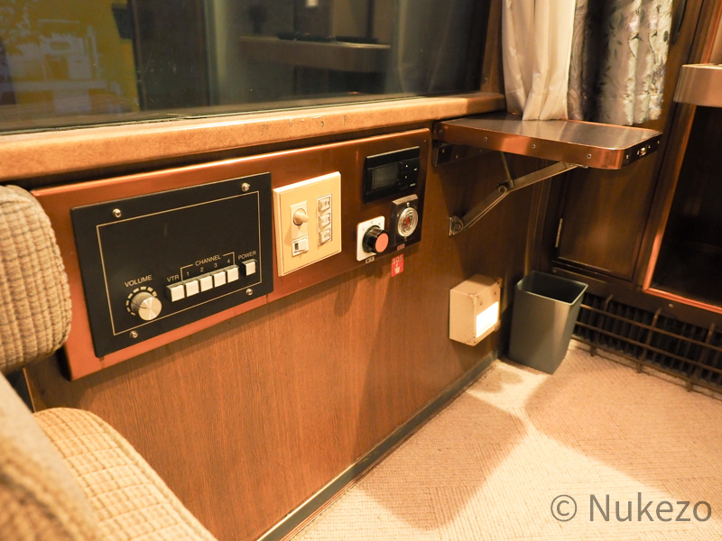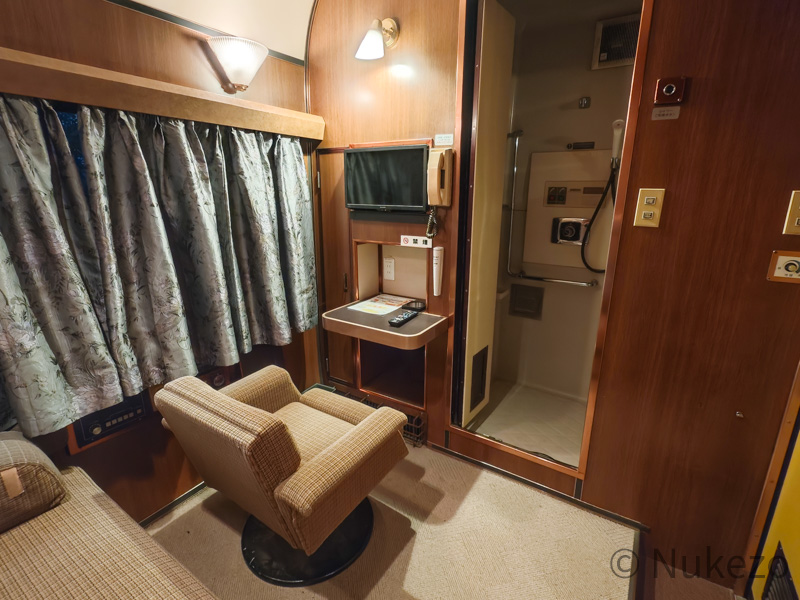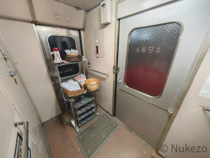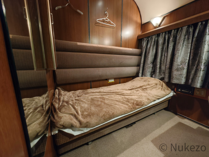 1号車の11号室・12号室が「ロイヤル」となっており、写真は11号室で撮影しています。シートカバーやリネン類こそ撤去されていますが、往時の雰囲気がよく残っていました。