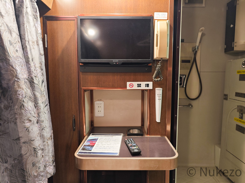 リビングスペースにはソファ・テーブル・テレビが備わります。奥にはかつてのシャワーブースとトイレがありますが、ユメノバへの移設後は使用停止となっているようで、室内灯も点灯しませんでした。