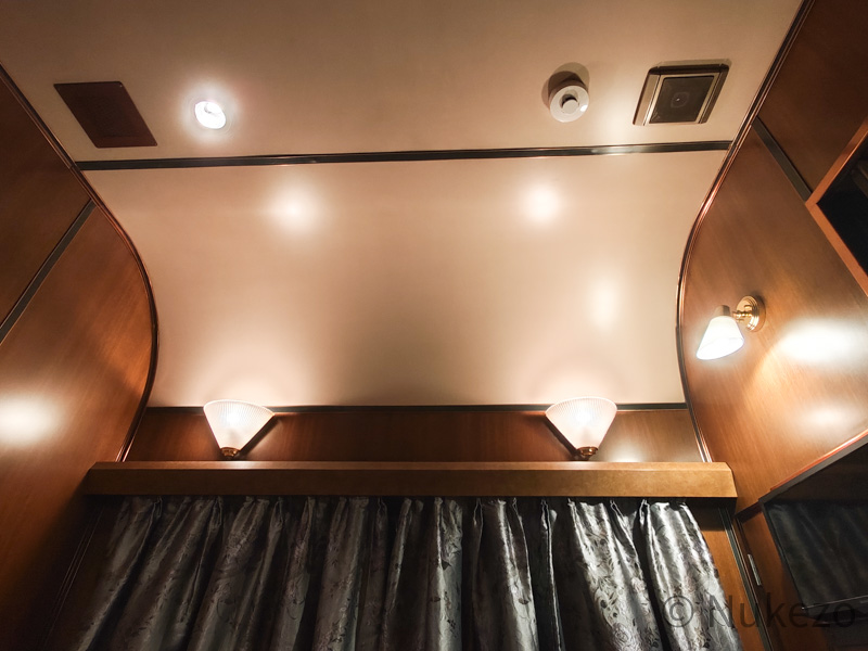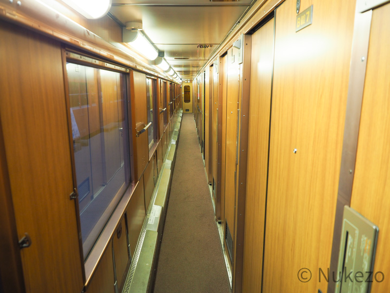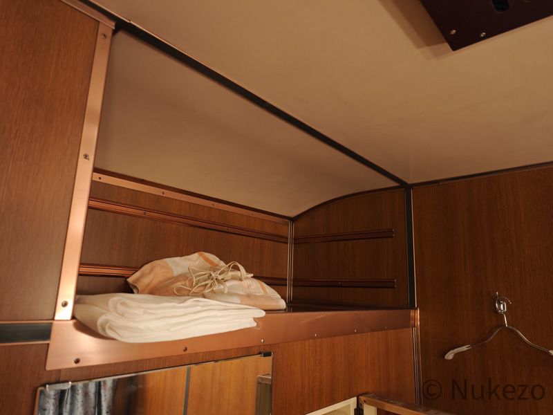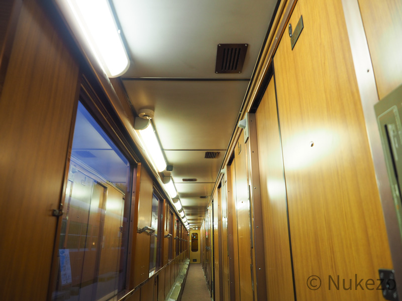 通路には濃い木目調が多用され、視覚上にも高級感を感じます。開放型B寝台からの改造ゆえか、特に窓~天井まわりには改造前の面影がチラチラと垣間見えるのが面白いところです。