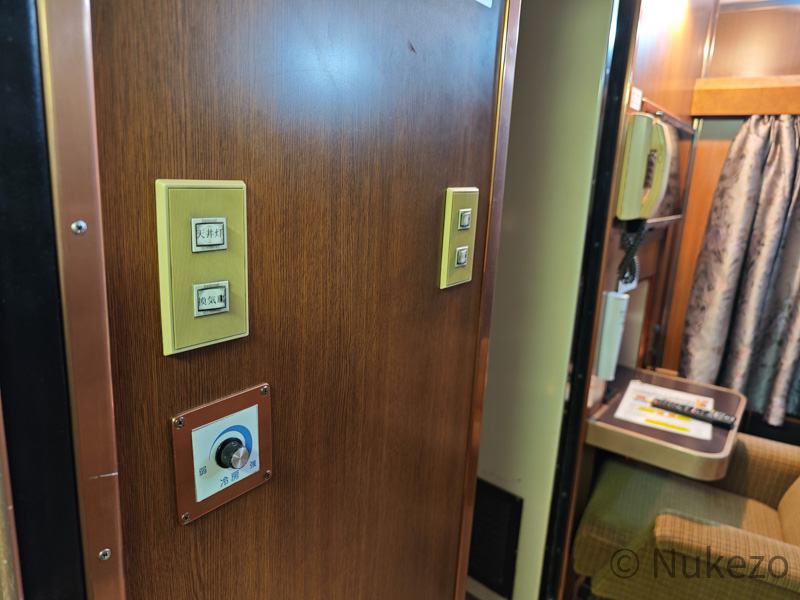取材時は秋口だったこともあってか、予備シーツのほかに電気毛布がセットされていました。寝台車の空調は自動設定となっており、(実体験として)朝夕はかなり冷えたのでありがたい設備に感じます。