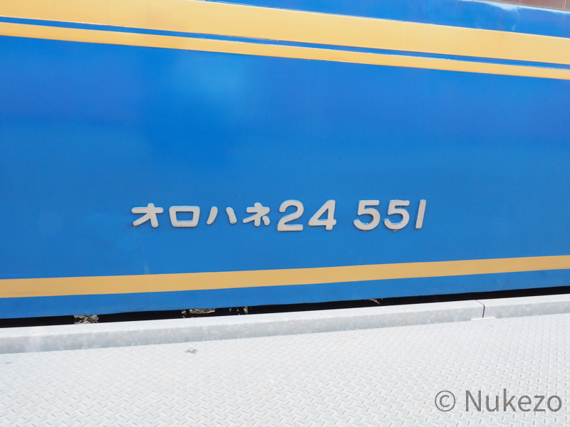 A寝台「ロイヤル」・B寝台「デュエット」の合造車であるオロハネ24 551の全景(左)と、車番のアップ(右/下)。