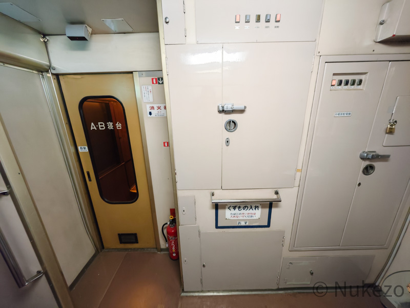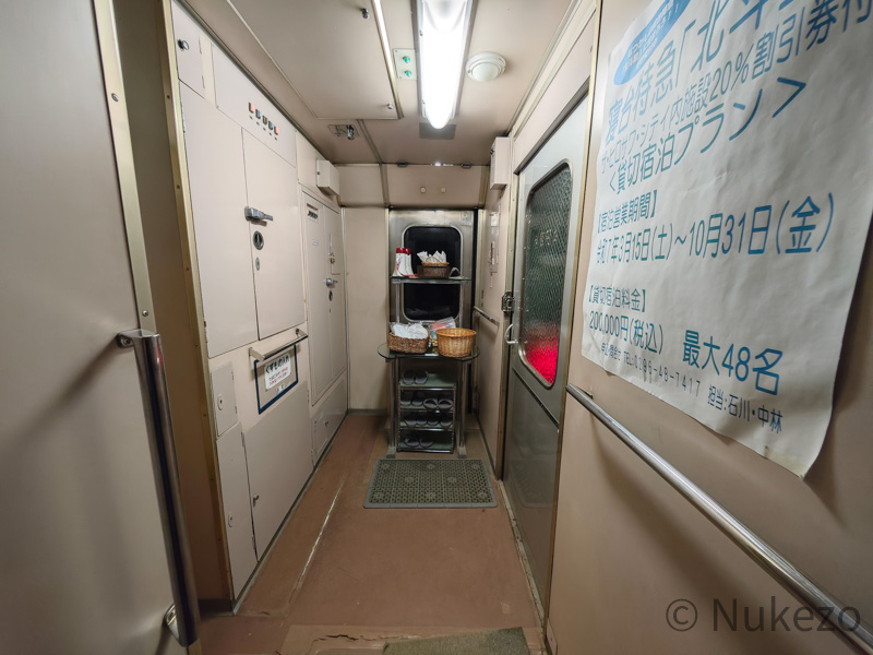 ユメノバでは1号車として案内されており、号車札も「1」を掲出。1973年に開放型B寝台として落成し、向日町→品川→青森と渡り歩いて1989年に「北斗星」に加わった車両です(→「補足」も参照)。