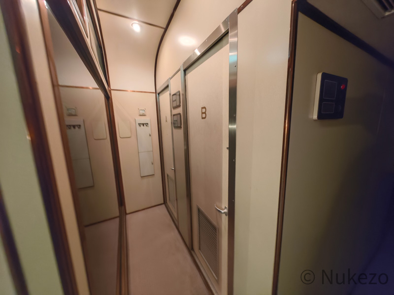 続いて4号車側のデッキ方向を見ていきます。全景(左/上)と、かつてのシャワー室の様子(右/下)。