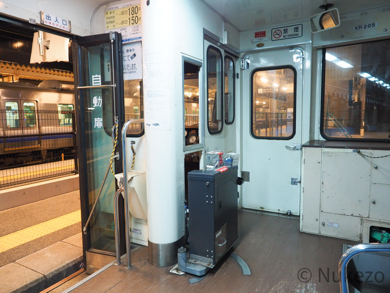 長~いロングシートですが、私が調べた書籍の情報だとKR200形(の前身のSKR200形)は座席定員48名とのことでした。…ということは、ロングシート片側の定員は実に24人がけということになります。