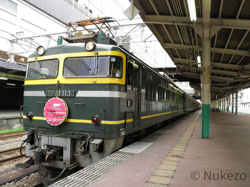 写真は早朝の長岡駅にたたずむトワイライトエクスプレス。本州内は、客車の塗色に合わせた専属のEF81型機関車が牽引しました。