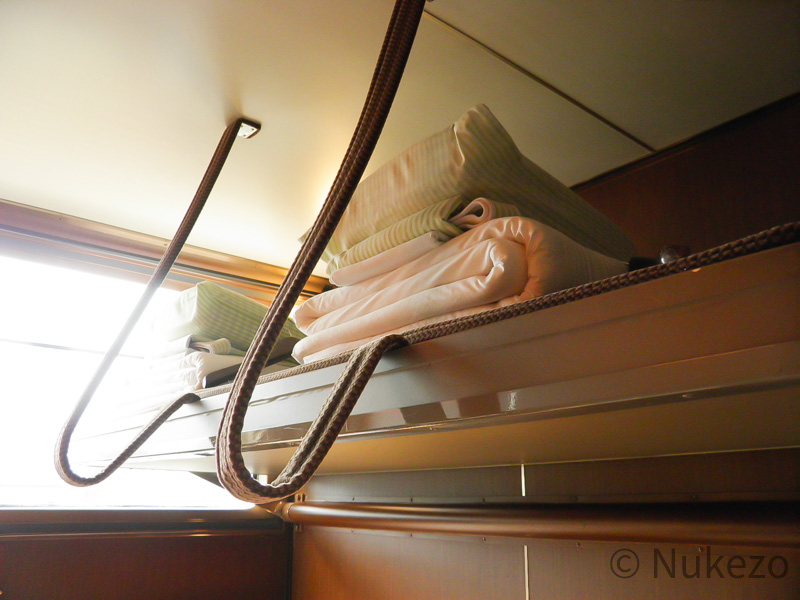 車内は線路と平行にベッドが並んでおり、分かりやすく言うと先ほどの「ツイン」をかなり狭くして配置を変えた感じでしょうか。なお、後年の>>サンライズ出雲・瀬戸の「シングルツイン」も、基本的な構造はトワイライトエクスプレスのそれを継承しています。
