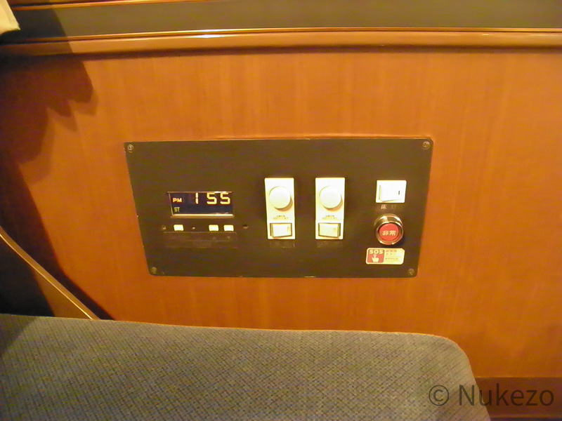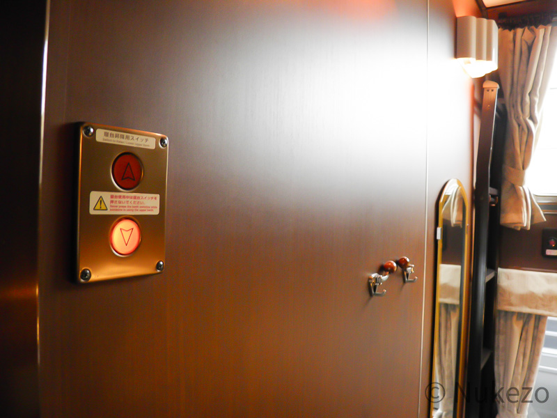 昇降スイッチは、開放型B寝台時代に通路側にあったものを移設してきたようです。昇降の装置自体が寝台をセットする係員用だったため、「ツイン」のこれは乗客側で操作できる貴重な昇降スイッチでした(→「備考」も参照)。