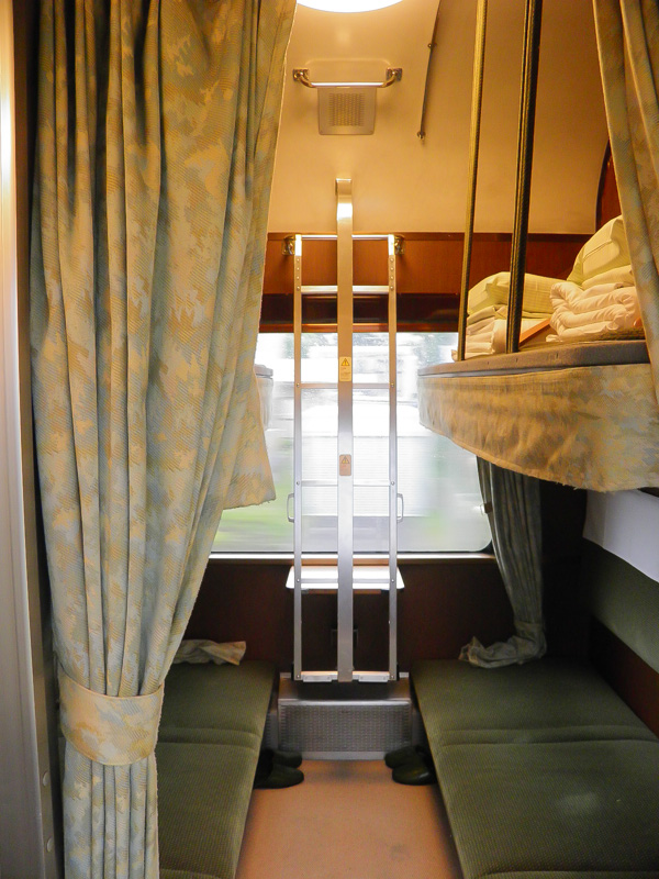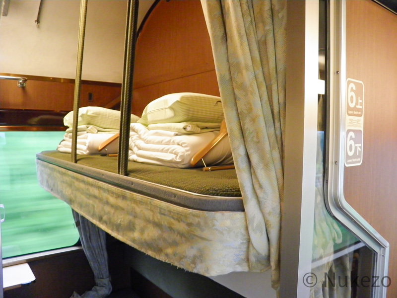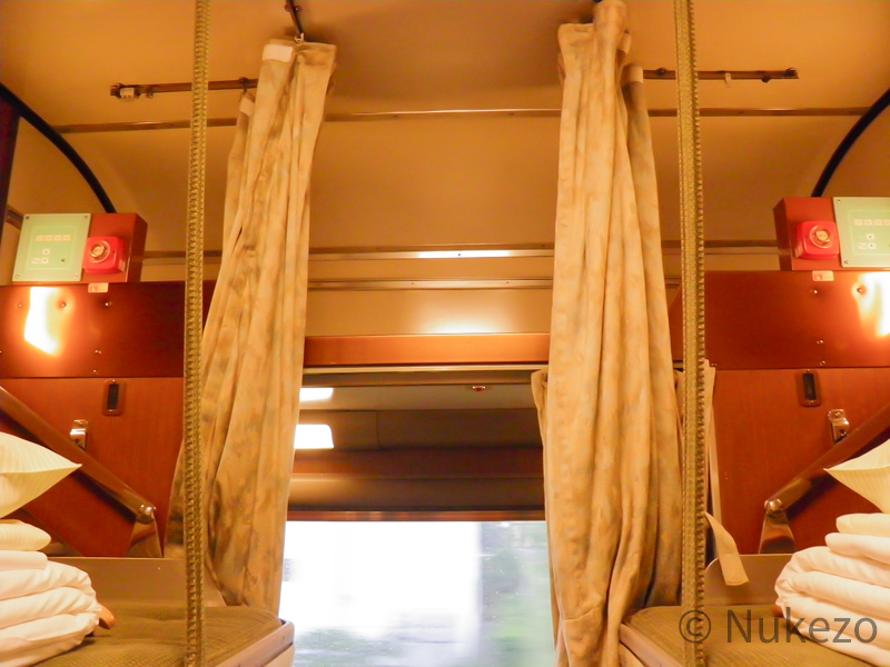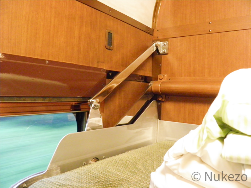 トワイライトエクスプレスは昼間の時間帯も走行することから、リネン類は上段寝台にまとめてセットされていました。寝台を“座席”として使用する時間が長いことにによるための措置のようです。