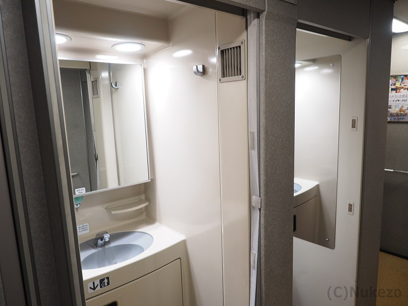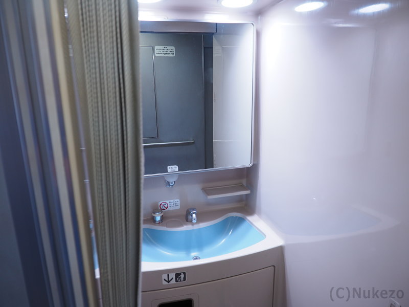 洗面台は、グリーン車も普通車も同一なのでまとめて紹介します。鏡は一面、温度調節機能がついた自動水栓を導入するなど、非常に無難な仕上がりでした。