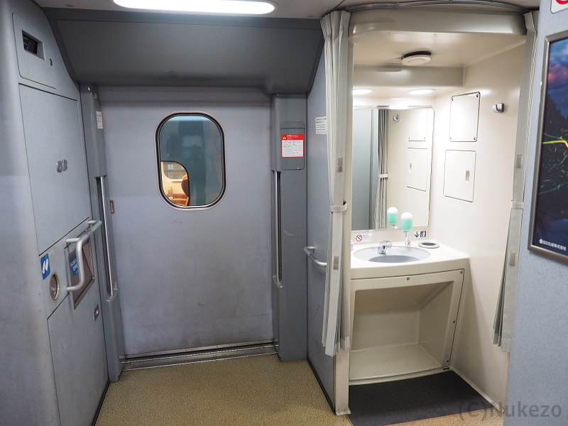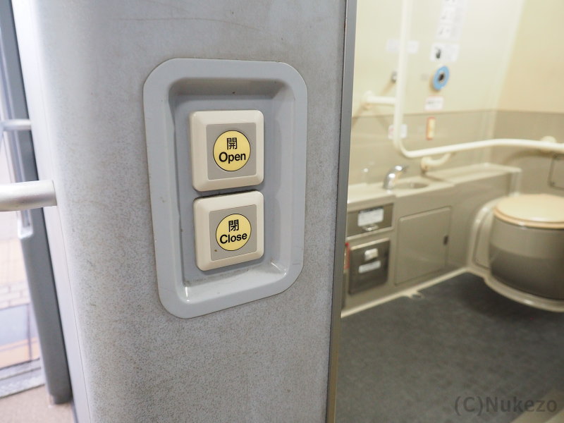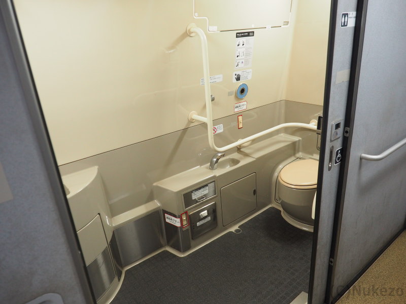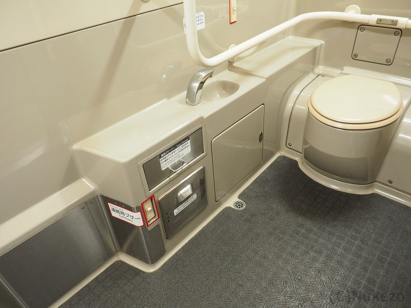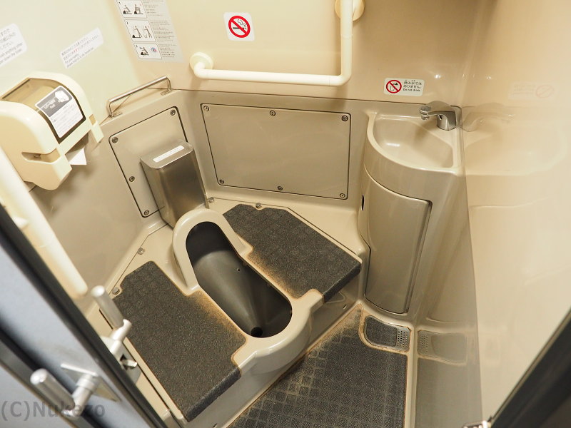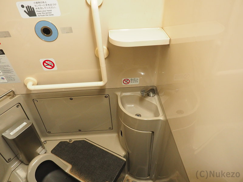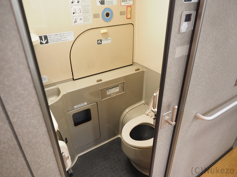 近年の車両でよく見られる「通路を片側に寄せ、車いすトイレ内部の空間を最大限確保する」という発想がなかった頃の車両のため、現代の基準からするとやや狭めな感は否めませんでした。