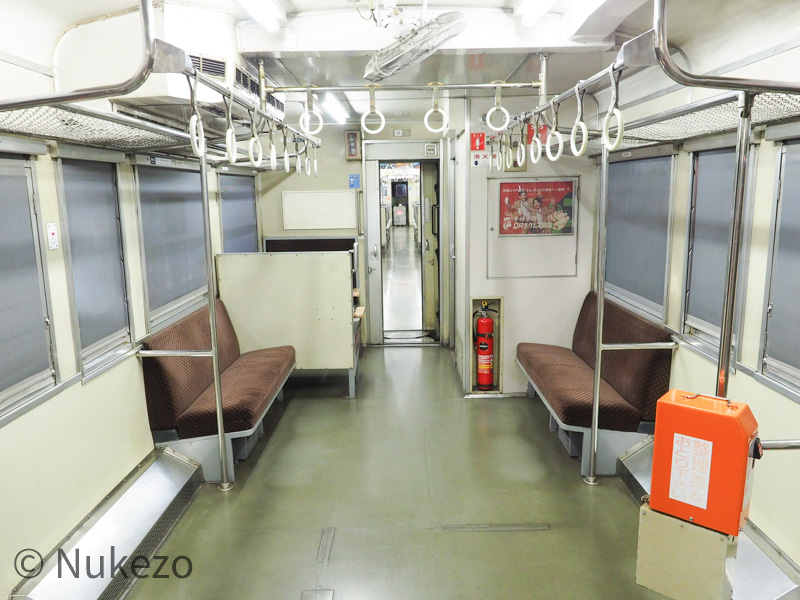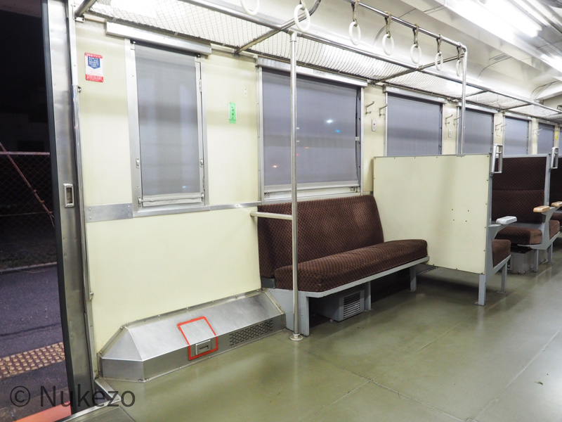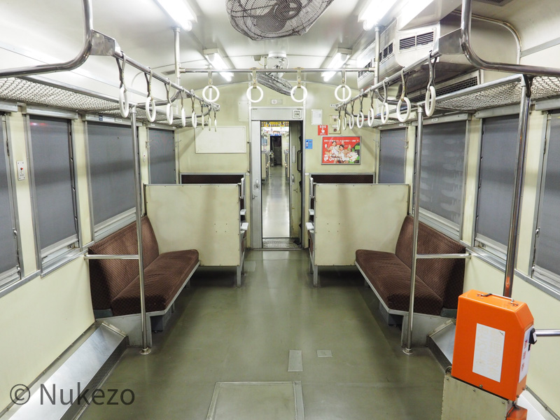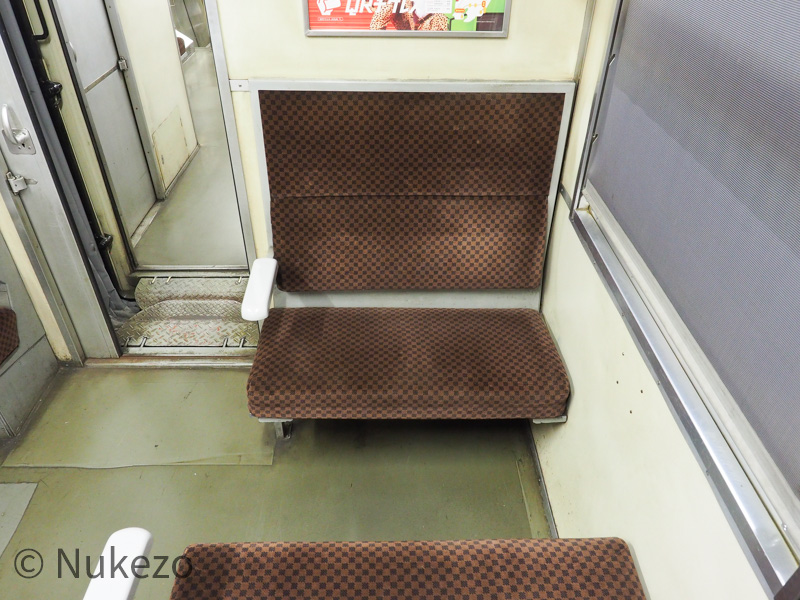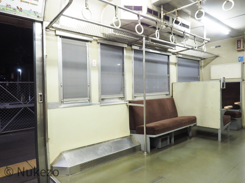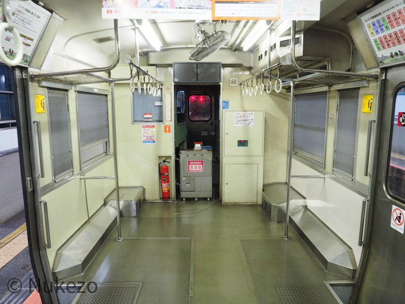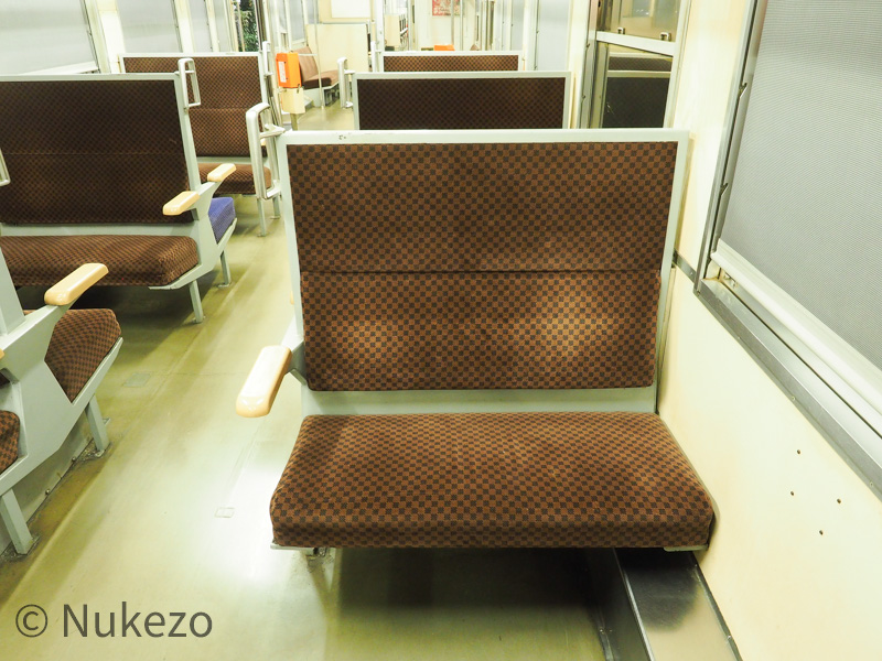 車内はおおむねデビュー当時からの雰囲気を残していますが、通勤ラッシュ対策なのか、ドア脇の座席が撤去されています。
