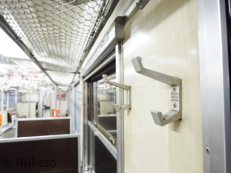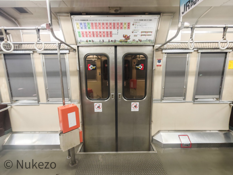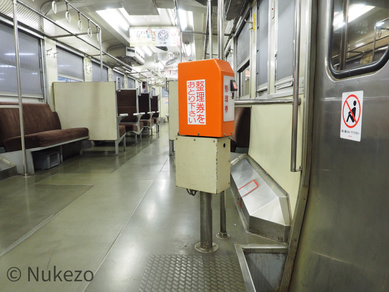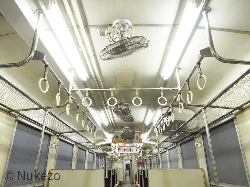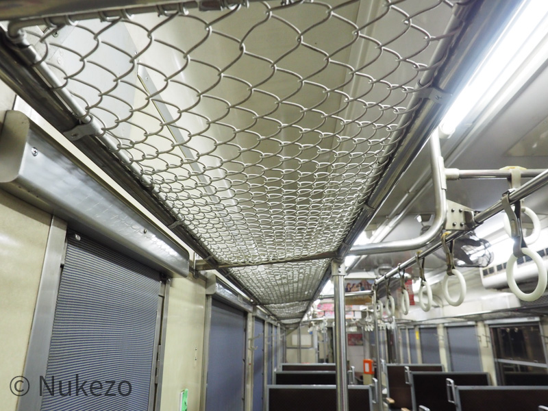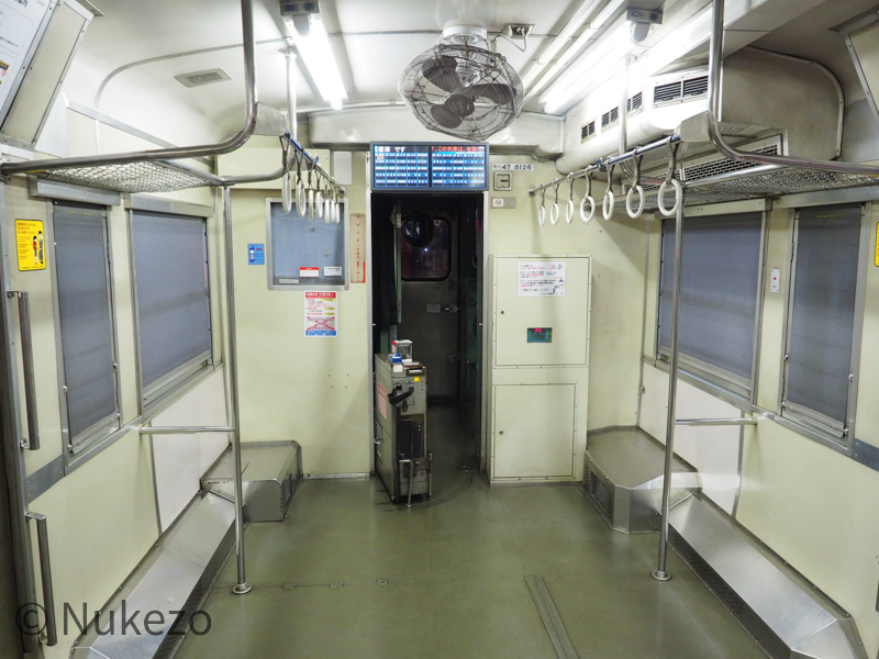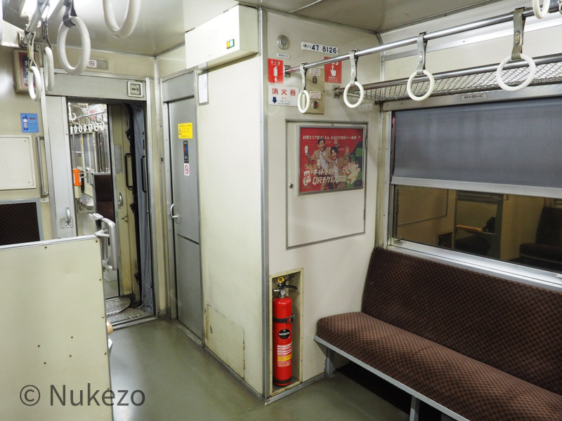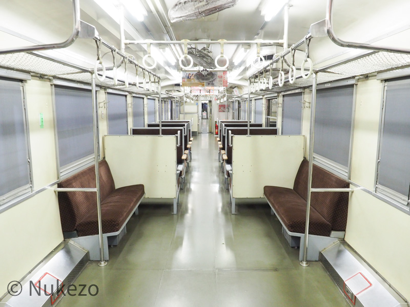 車内はおおむねデビュー当時からの雰囲気を残していますが、通勤ラッシュ対策なのか、ドア脇の座席が撤去されています。