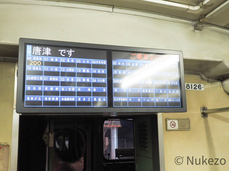 写真は唐津駅にて発車待ちのキハ47形。利用促進をもくろんだ「>>ロマ佐賀列車」のラッピングが施されていますが、ベースの塗色は国鉄晩年から続く九州色を堅持しています。さっそく車内を見ていきましょう。