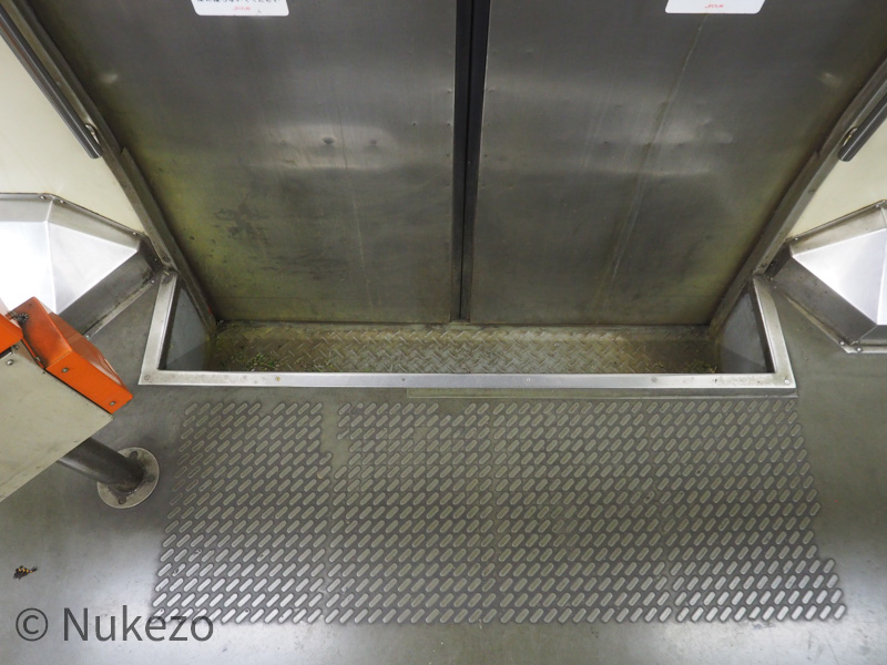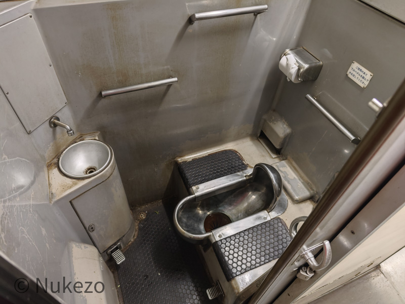 トイレはデビュー当時からこんな感じと思われ、特に手が加えられた形跡はありません。錆びや汚れがあちこちに見られるのは、この車両の経年を考えると致し方ないところでしょうか。トイレ自体はきれいに維持されていました。