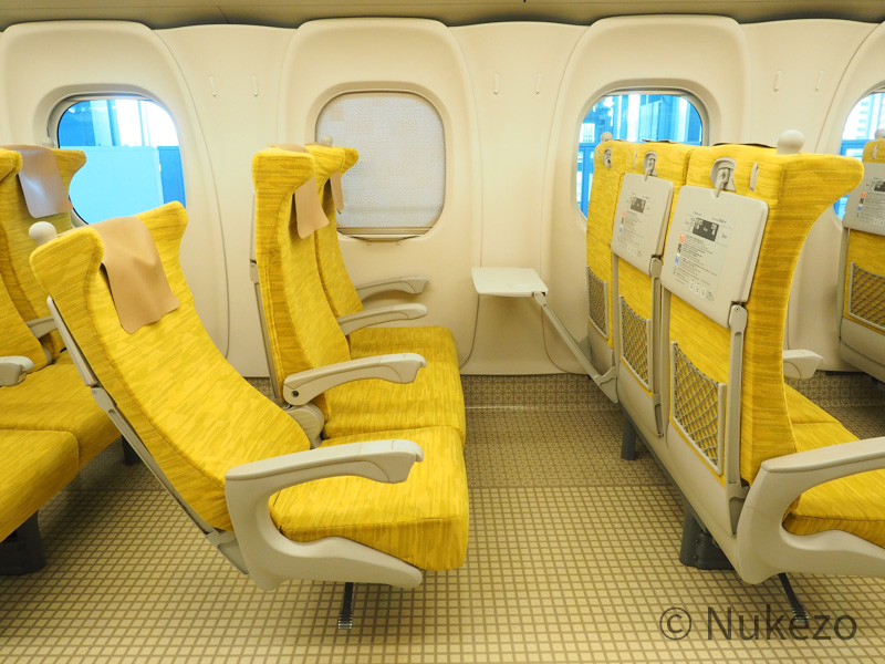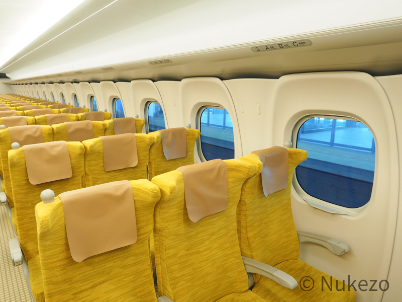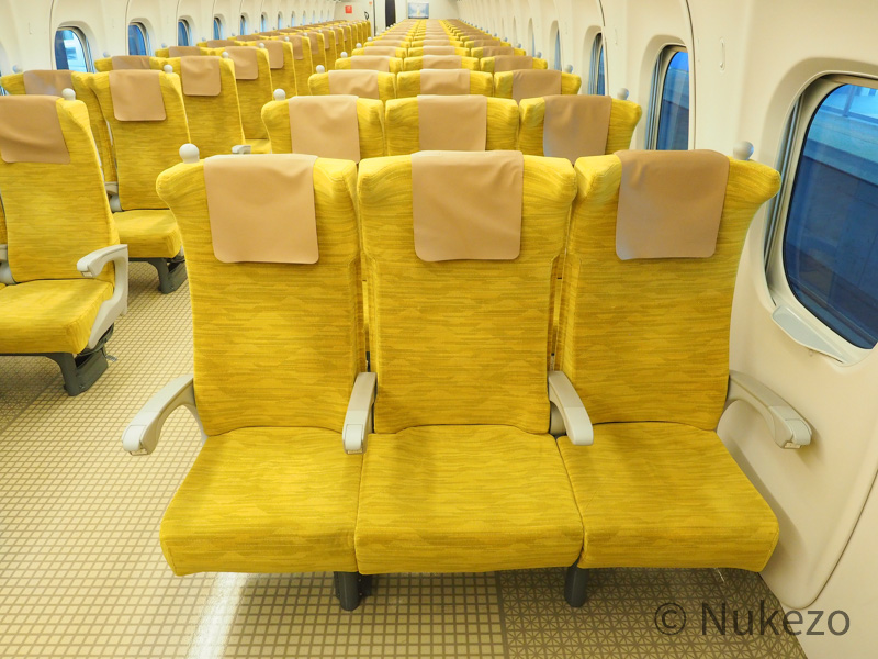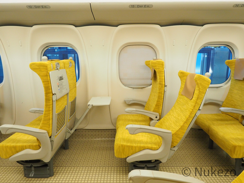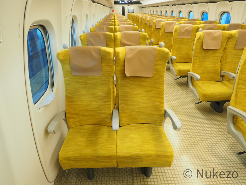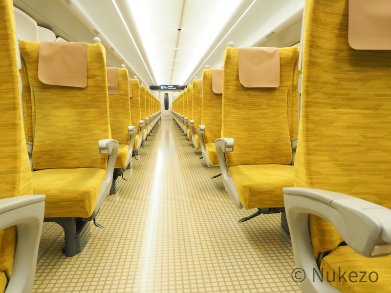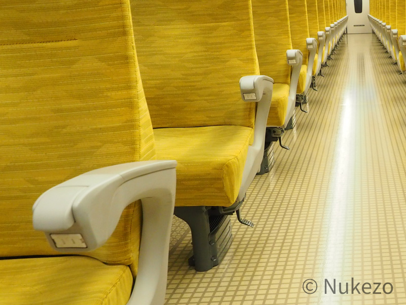 車内には、イエロー系のモケットをまとった座席が2+3配置で展開。指定席の1~3号車は比較的“水戸岡色”が強い内装でしたが、こちらは言ってしまえばN700S系の座席モケット・床材違いです(苦笑)。
