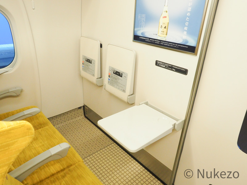 自由席では、(インアームテーブルのある指定席とは異なり)荷物スペース・壁際にテーブルが設置されています。PCなどにも対応した大型テーブルとなっており、テーブルだけに限れば指定席より恵まれています(苦笑)。