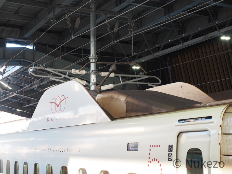内外装ともに「KAMOME」一色なN700S系8000番台ですが、よく見るとパンタグラフのカバーにもしっかり「KAMOME」のロゴが。ここまで「KAMOME」全推しな車両もなかなか珍しいのではないでしょうか。