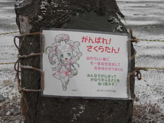 (追記:この「さくらたん」は2011年春に一度花をつけたものの、翌2012年には枯死と判定。その後、伐倒された「さくらたん」」の幹は地蔵尊に加工され、現在は「桜咲く地蔵」として女川シルバーピアの一角で女川の街を見守っています。>>参考※女川町町観光協会HP)