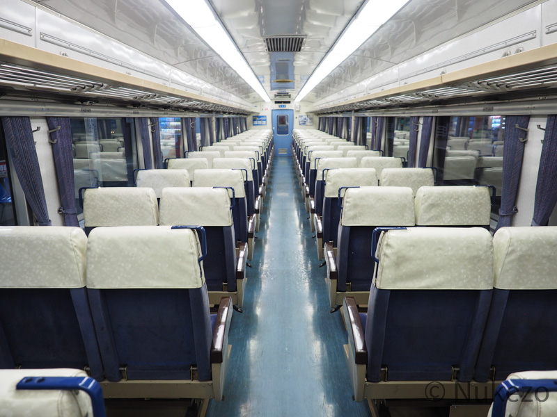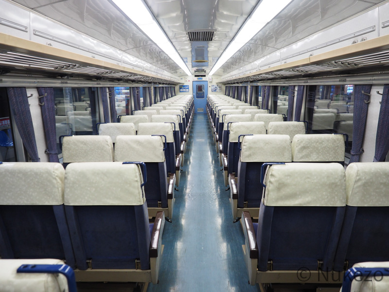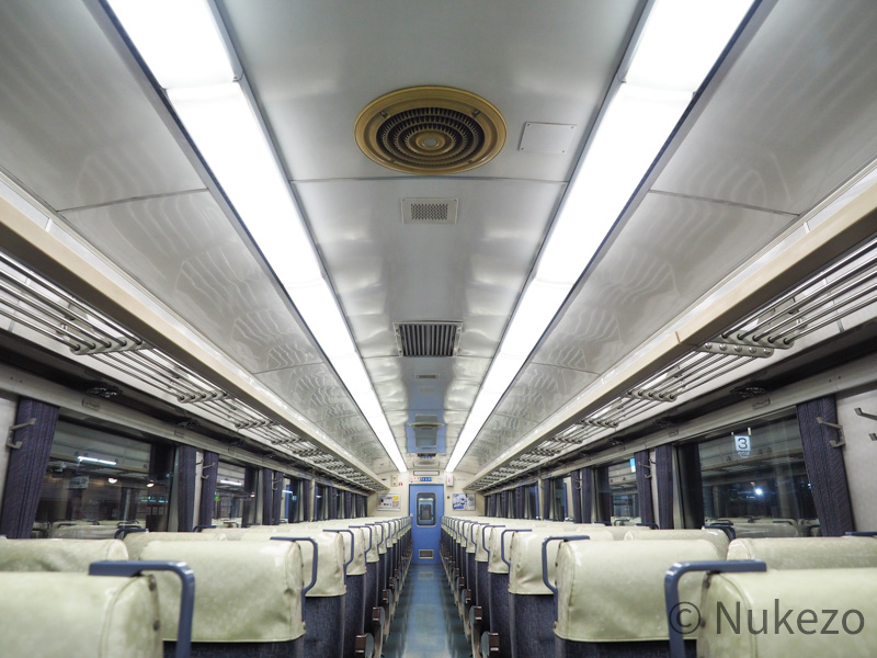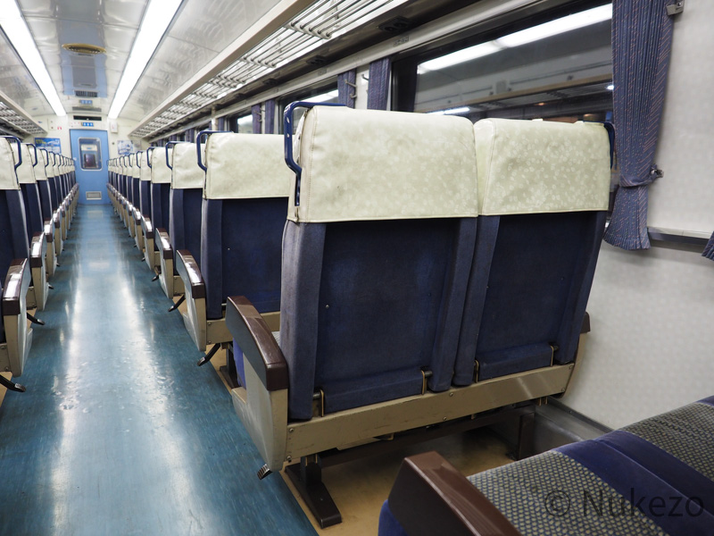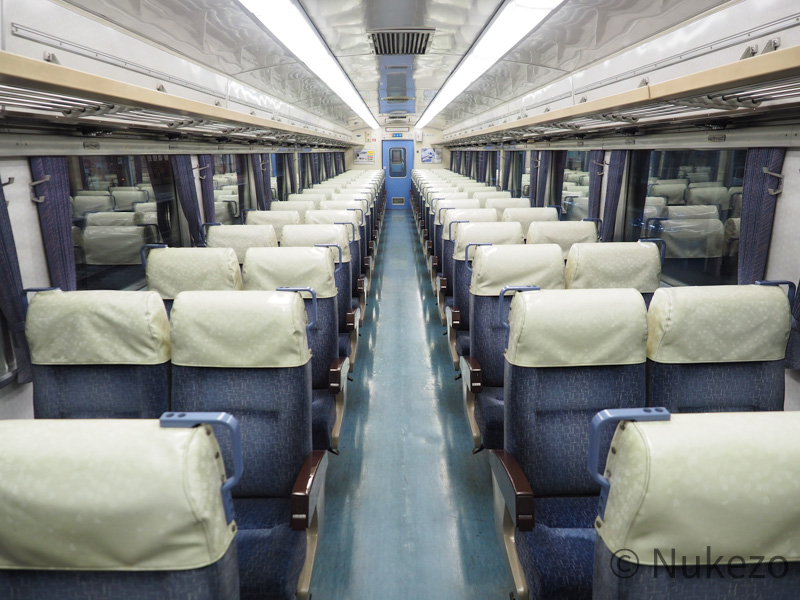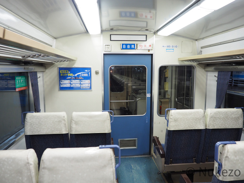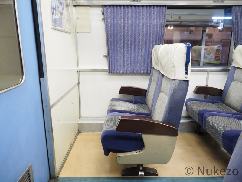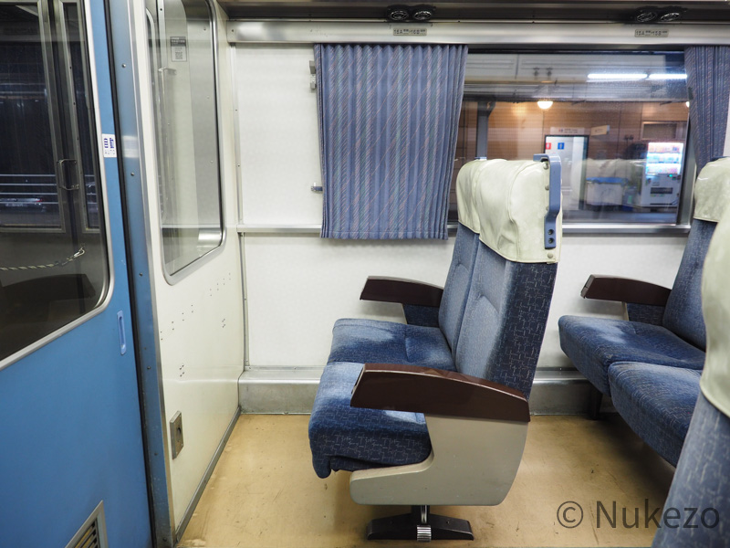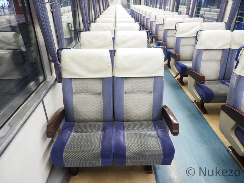 座席カバーはビニール製のポケットタイプに変わっていますが、このアングルから見る分には特急時代と大きな違いはありません。座席モケット自体は>>キハ185系の特急車(「剣山」の項参照)で見られるのと同じです。