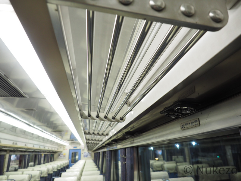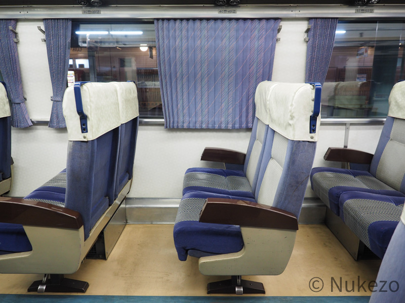 座席のフレーム自体は、「車内全景 その1」で紹介したものと同じです。モケットは経年ゆえかやや色あせが進行していますねぇ。