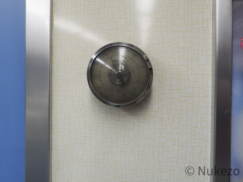 デッキと客室の仕切扉(左/上)と、扉わきの温度計(右/下)。