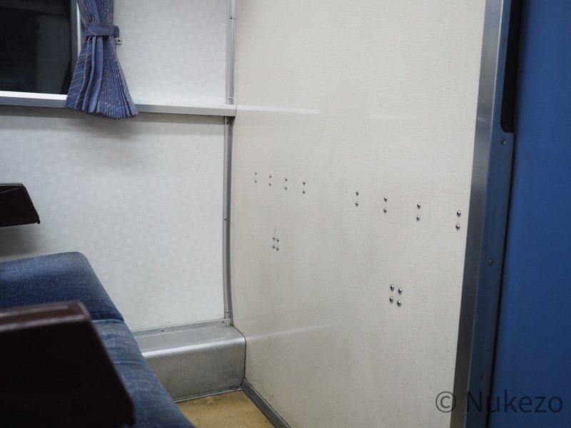 3100番台化に伴ってテーブル・網ポケットは全て撤去されました。とくに車端部は、撤去跡のビス止めが特に隠すこともなくそのまま残っており、うっすらとですがテーブル跡の輪郭も見えます。