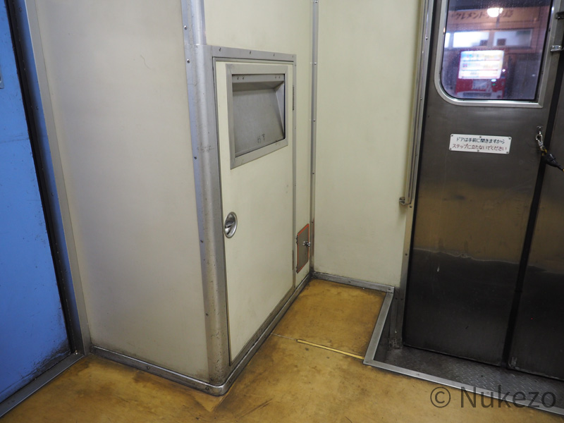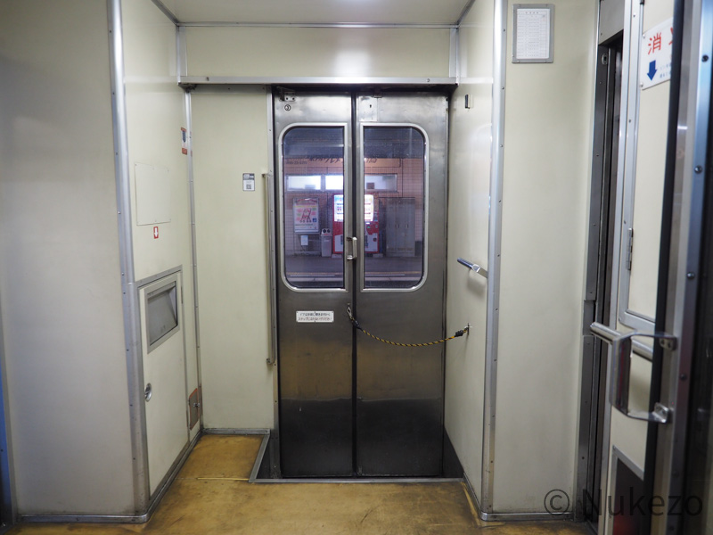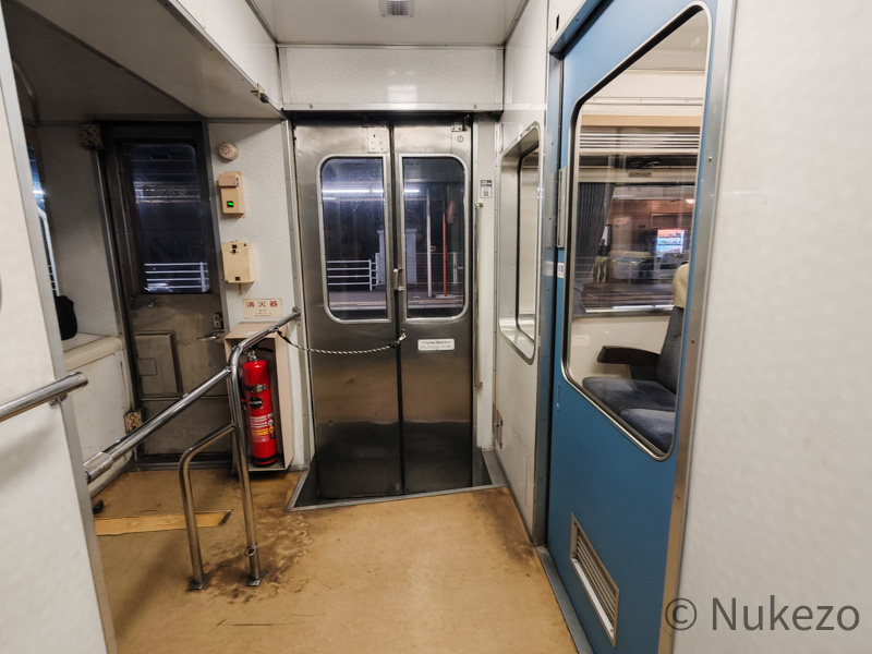 キハ185系3100番台にはトイレ・洗面台がないため、デッキ部分の通路は至極あっさりとしています。床材はやや年季が入り始めていますが、これは経年ゆえ仕方ないところでしょうか。